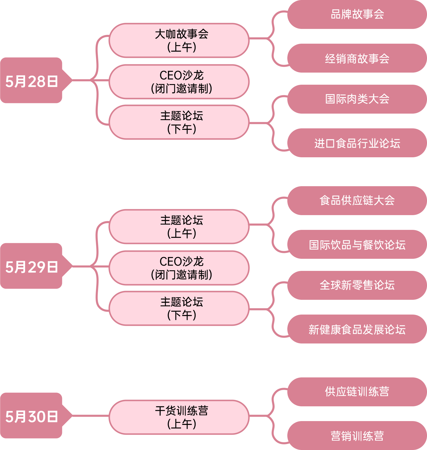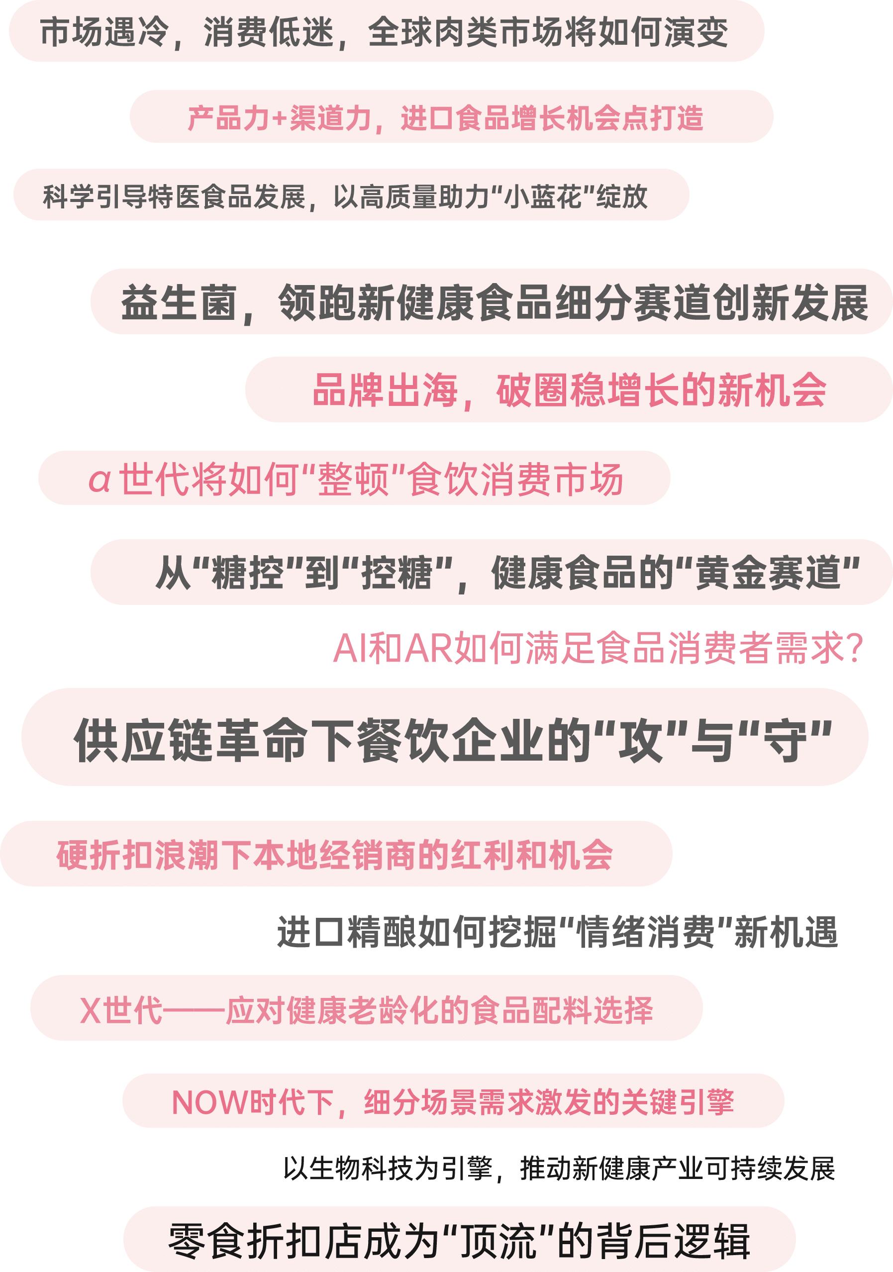 | 峰會(huì)將圍繞新零售、供應(yīng)鏈、肉類、飲品、新健康食品、食品科技、進(jìn)口食品、中餐等食飲行業(yè)熱門品類及話題舉辦10場(chǎng)主題論壇 | |||