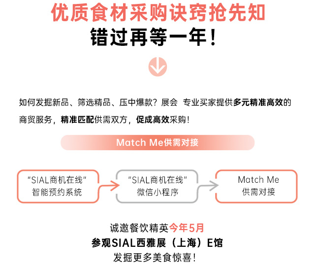 穩(wěn)定可靠的高品質(zhì)食材供應(yīng)鏈,已經(jīng)成為餐企健康發(fā)展的關(guān)鍵支撐。今年SIAL西雅展(上海)將同期舉辦SIAL西雅國際餐飲供應(yīng)鏈展,屆時(shí)E館將匯聚全球優(yōu)質(zhì)食材,為餐飲人士提供更多采購選擇!