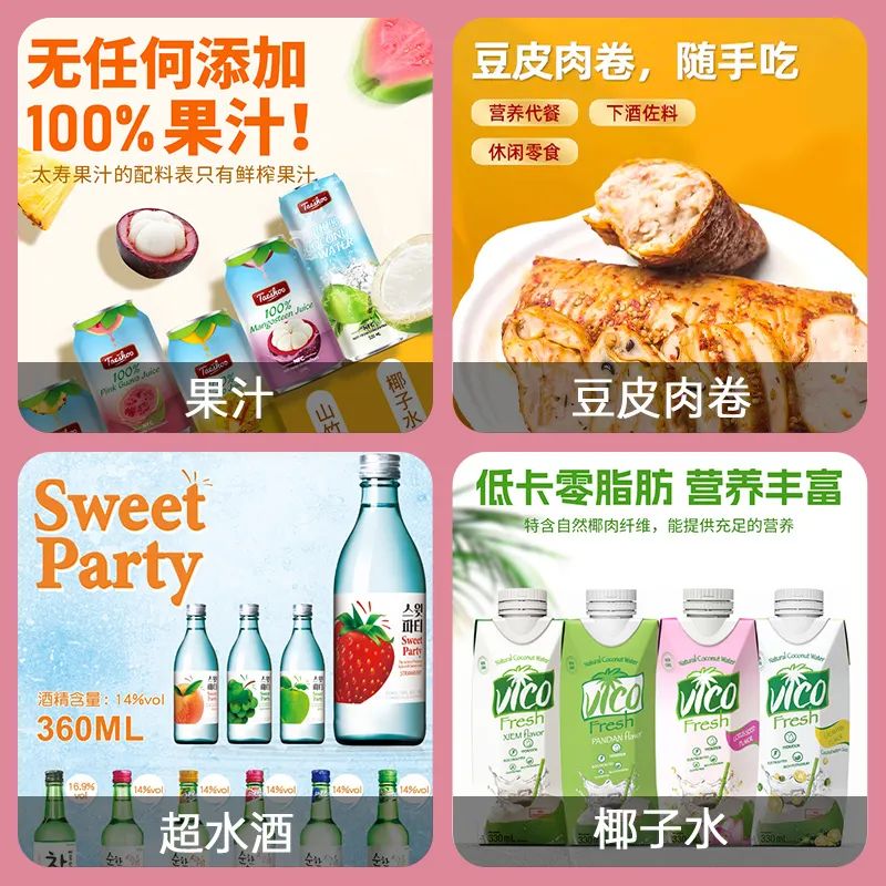 超水燒酒在韓劇中出鏡率極高,可以說是國民必備小酒,口感柔和、清爽,原料里添加的木糖醇和蜂蜜,掩蓋了燒酒本身辛辣苦澀的味道,果香濃郁,喝起來甜味兒更足!太壽100%椰子水由越南最大的椰子加工公司ACP出品,選用產(chǎn)自湄公河三角洲"椰子之都"檳枷省自然成熟的優(yōu)質(zhì)椰子。太壽100%果汁的原料水果全部選自越南當?shù)厮a(chǎn)區(qū)的成熟新鮮水果。越南是熱帶季風氣候,光照充足,雨量充沛,特別適合熱帶水果生長,產(chǎn)出的熱帶水果口味極佳。豆皮肉卷遵循傳統(tǒng),手工卷制,秘制鹵汁腌制,果木熏烤,非油炸更健康,葷素搭配,口感豐富,營養(yǎng)美味。