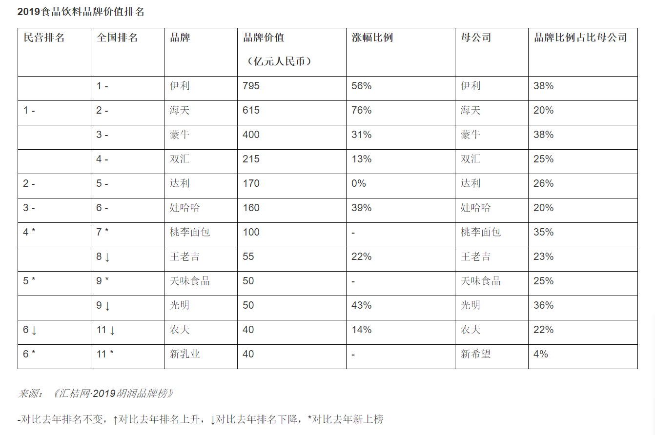 近日,胡潤研究院聯(lián)合匯桔網(wǎng)發(fā)布《匯桔網(wǎng)·2019胡潤品牌榜》,評出了最具價值的中國本土品牌200強,貴州茅臺以6400億元的品牌價值第二次成為“最具價值中國品牌”。在食品飲料榜單上,伊利蟬聯(lián)食品飲料行業(yè)冠軍,品牌價值比去年增長56%至795億元。海天與蒙牛仍排第二、第三名。食品飲料行業(yè)共有12個品牌上榜(去年為10個),其中7個為民營品牌。食品飲料行業(yè)上榜品牌的品牌價值總和占整張榜單的3%。廣東,內蒙古,浙江和四川是食品飲料行業(yè)上榜品牌最多的地區(qū),各有2個品牌上榜。