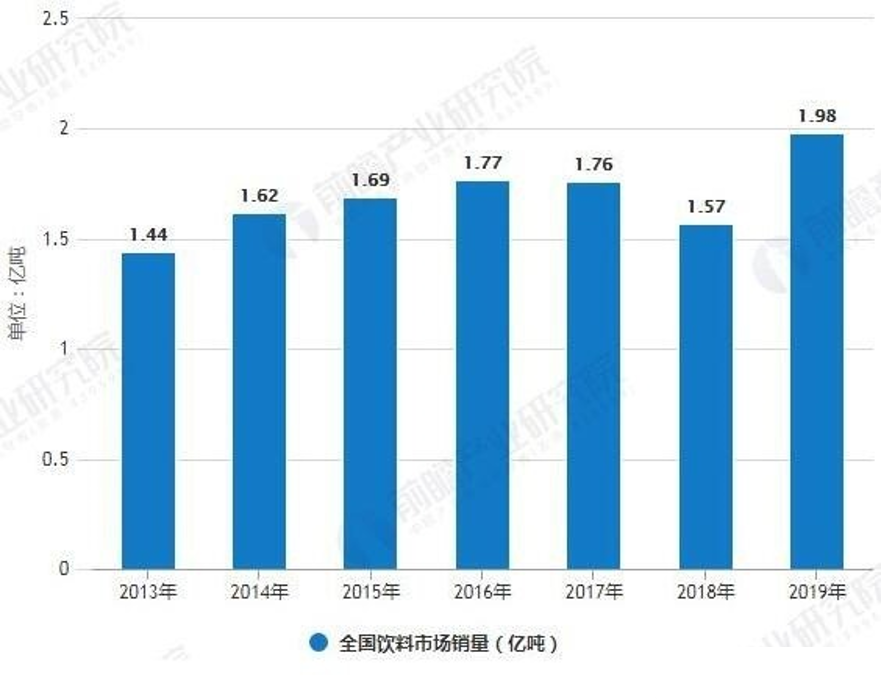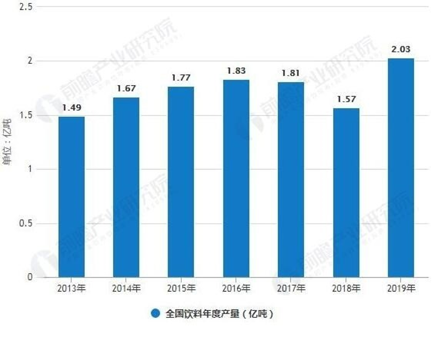 當前,龐大的中國飲料市場依舊保持增長,據前瞻產業(yè)研究院發(fā)布的《中國軟飲料行業(yè)產銷需求與投資預測分析報告》統(tǒng)計數據,截止至2018年底,全國飲料產量為15679.2萬噸,同比增長6.9%。預測2019年中國飲料市場將保持增長,產量將突破2億噸,達到2.03億噸。