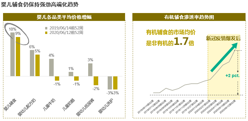 盡管品類(lèi)增速趨緩,市場(chǎng)仍有強(qiáng)勁的發(fā)展機(jī)會(huì)。嬰兒輔食平均價(jià)格增速高達(dá)9%,位居各嬰兒品類(lèi)之首,且高端化態(tài)勢(shì)持續(xù)。而有機(jī)輔食是推動(dòng)高端化的一大驅(qū)動(dòng)力,它的均價(jià)是市場(chǎng)平均的1.7倍,從數(shù)據(jù)可看出有機(jī)輔食的滲透率持續(xù)攀升且在疫情后加速增長(zhǎng)。