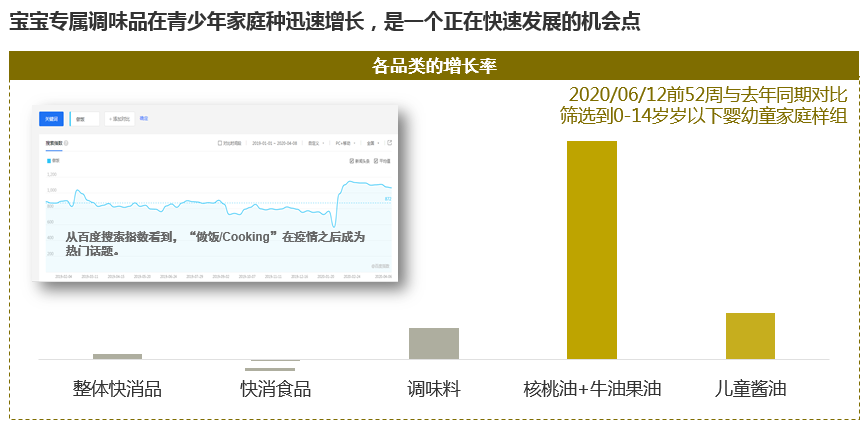 從數(shù)據(jù)中可以看到,適合添加在輔食中利于寶寶成長(zhǎng)的核桃油、牛油果油、兒童醬油在14歲以下的有孩家庭中迎來(lái)了快速發(fā)展,因此,品牌商也可從廣義的輔食或嬰幼童食品市場(chǎng),找到增長(zhǎng)的切入點(diǎn)。