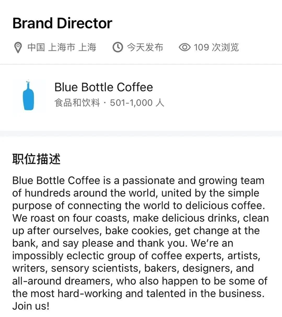 昨天,這事好像有點(diǎn)眉目了:起因是一張來自Linkedin領(lǐng)英的截圖,顯示藍(lán)瓶咖啡正在招聘“品牌總監(jiān)”,工作地點(diǎn)在上海。