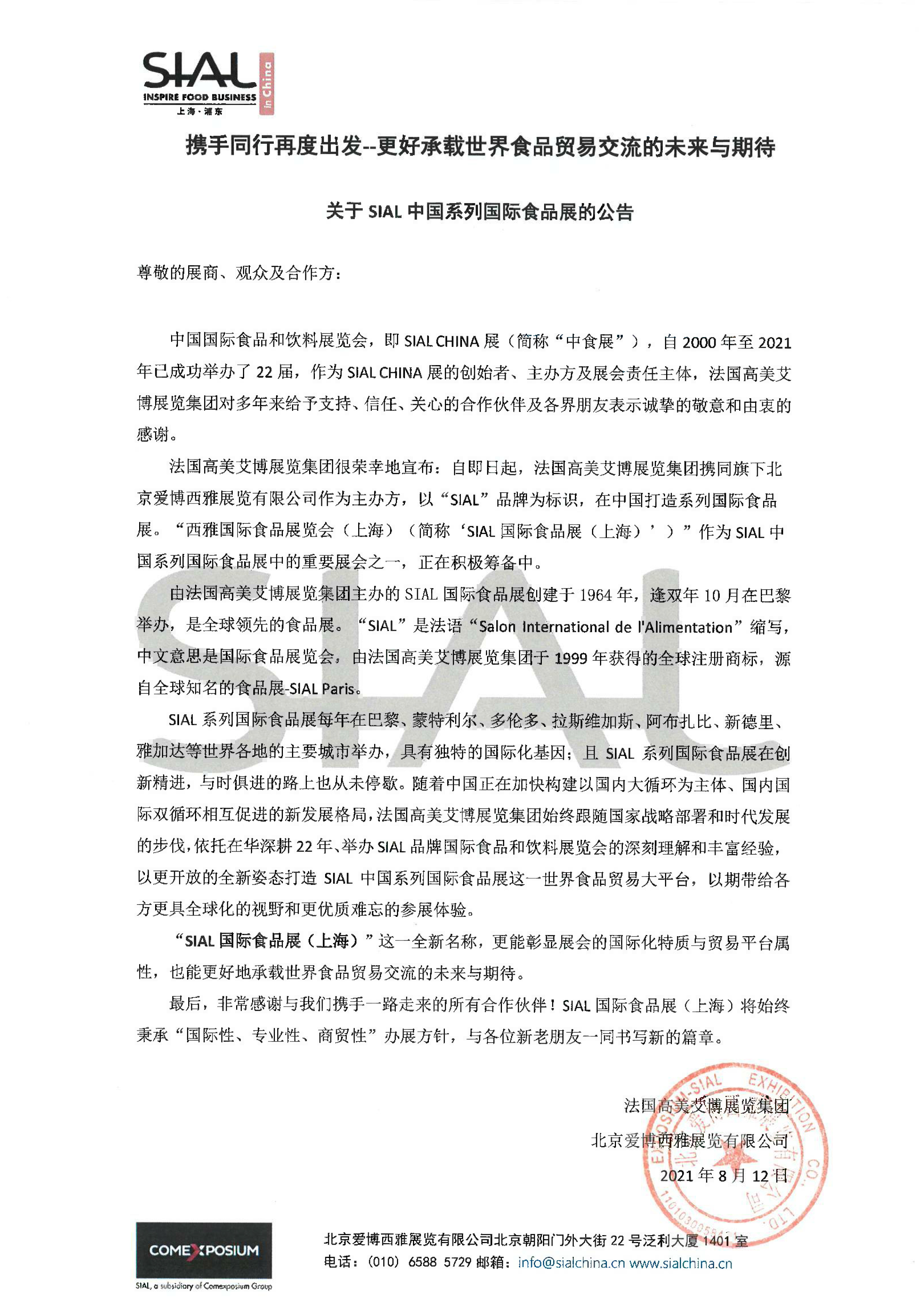 攜手同行再度出發(fā)--更好承載世界食品貿(mào)易交流的未來與期待 關(guān)于SIAL中國系列國際食品展的公告