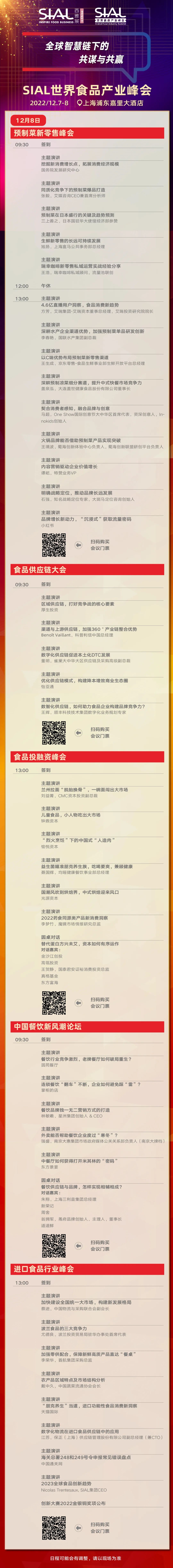 SIAL世界食品產(chǎn)業(yè)峰會(huì)將于2022年12月7日-8日如期舉辦!峰會(huì)將以“全球智慧鏈下的共謀與共贏“為主題舉辦包含預(yù)制菜、新零售、供應(yīng)鏈、農(nóng)業(yè)食品科技、食品投融資、營(yíng)養(yǎng)健康食品、植物性食品、乳業(yè)、肉類、飲品、中餐、進(jìn)口食品在內(nèi)的多場(chǎng)主題論壇。