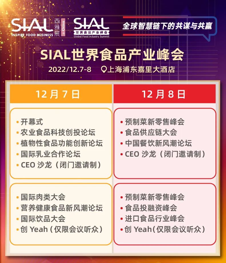 SIAL世界食品產(chǎn)業(yè)峰會將于2022年12月7日-8日如期舉辦!峰會將以“全球智慧鏈下的共謀與共贏”為主題舉辦包含預制菜、新零售、供應(yīng)鏈、農(nóng)業(yè)食品科技、食品投融資、營養(yǎng)健康食品、植物性食品、乳業(yè)、肉類、飲品、中餐、進口食品在內(nèi)的多場主題論壇。