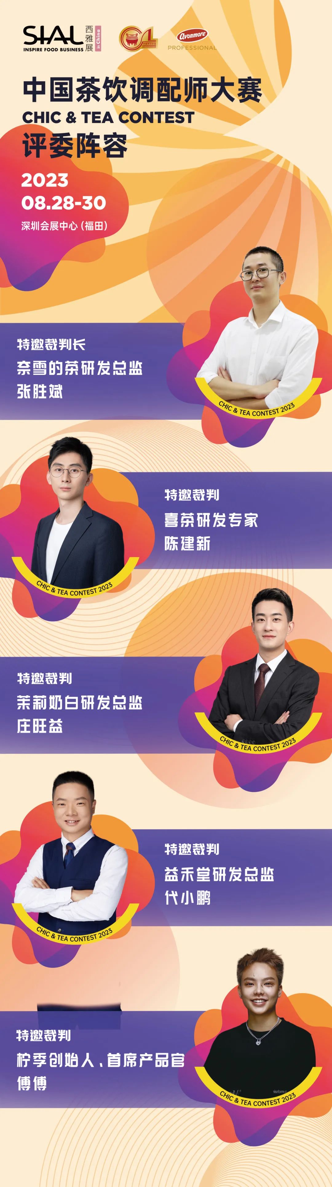 喜茶、奈雪的茶、益禾堂、檸季、茉莉奶白共計(jì)5位品牌創(chuàng)始人、研發(fā)負(fù)責(zé)人將出席第二屆SIAL中國(guó)茶飲調(diào)配師大賽,作為特邀裁判組成專業(yè)裁判團(tuán)隊(duì),對(duì)競(jìng)技選手進(jìn)行專業(yè)評(píng)判與打分,確保比賽公平公正,評(píng)選出優(yōu)秀的茶飲調(diào)配師及茶飲作品。