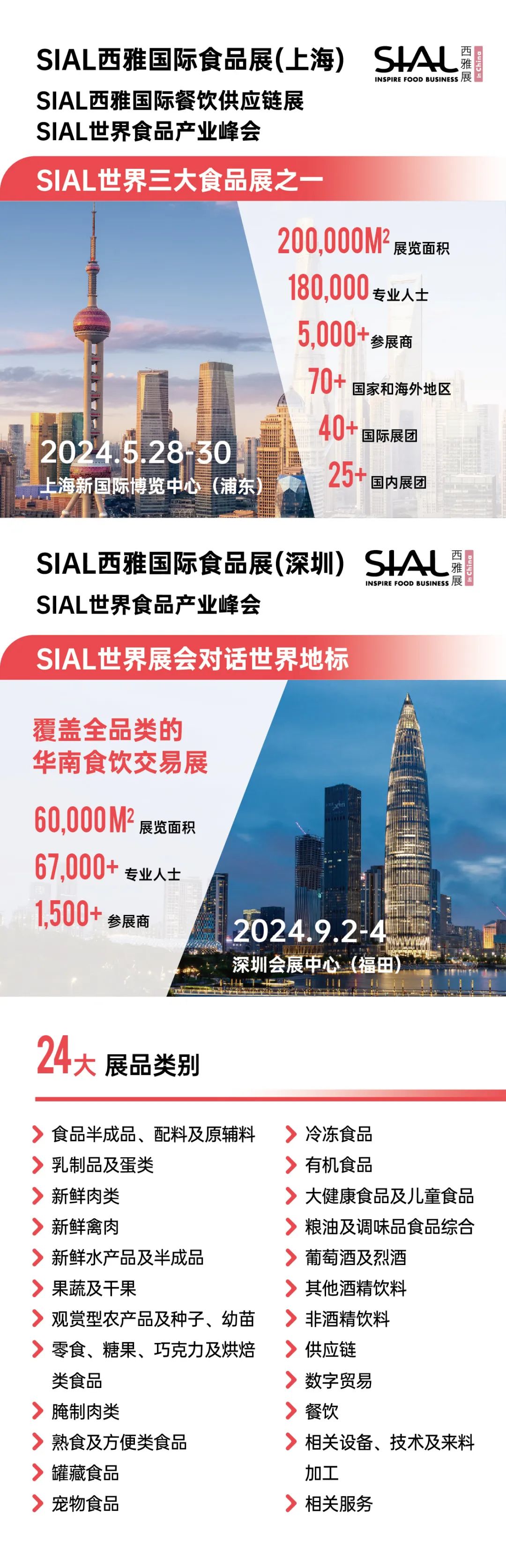 2024年5月28-30日,SIAL世界三大食品展之一的SIAL西雅展(上海)將于上海新國(guó)際博覽中心(浦東)舉辦;2024年9月2-4日,SIAL西雅展(深圳)將于深圳會(huì)展中心(福田)舉辦。雙展規(guī)模體量將再次全面超越往屆,未來(lái)無(wú)限,敬請(qǐng)期待。