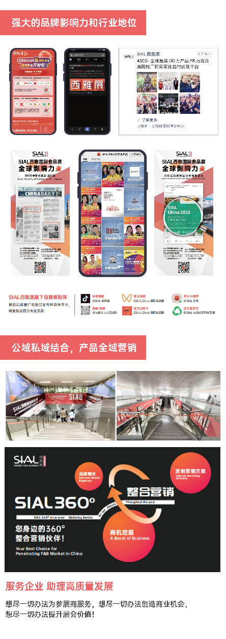 SIAL作為國(guó)際領(lǐng)先的食品飲料大展,不僅擁有強(qiáng)大的品牌影響力、豐富的專業(yè)買家資源,還具備全鏈路、全觸點(diǎn)、全洞察的能力。它以數(shù)據(jù)驅(qū)動(dòng),以消費(fèi)者為中心,全面覆蓋展前、展中、展后,構(gòu)建了一個(gè)智能化營(yíng)銷矩陣,幫助企業(yè)提升品牌知名度、發(fā)掘商機(jī)、促進(jìn)產(chǎn)品流通。