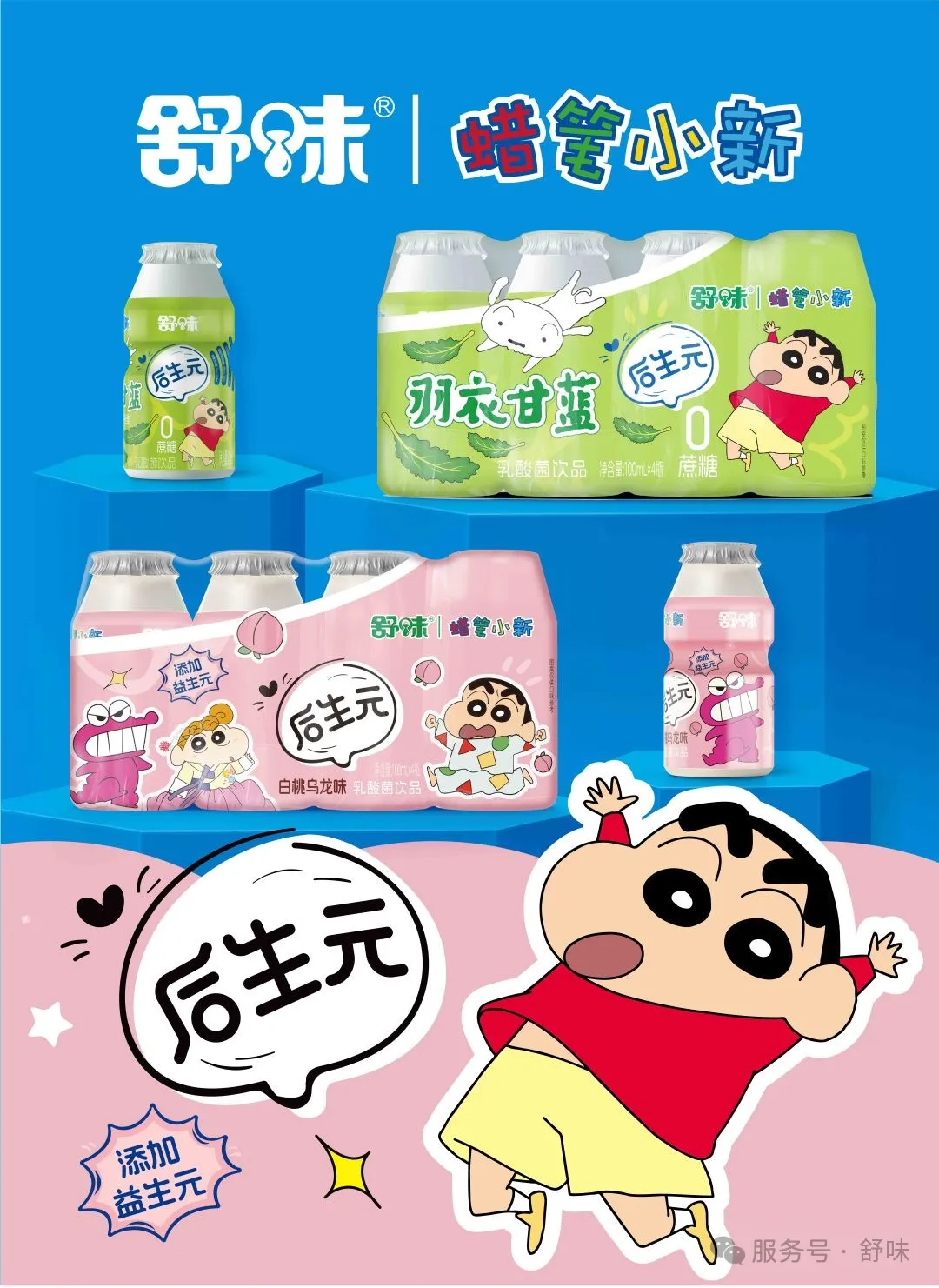 產(chǎn)品亮點:聯(lián)合活潑可愛的蠟筆小新形象推出的舒味乳酸菌,添加牛磺酸、益生元,自然發(fā)酵,純正好味,0脂健康,適合朋友小聚時來一瓶。