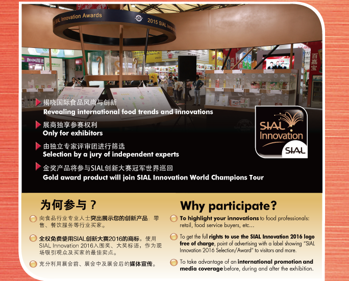 You can register all your new products free of charge as of January,2016. Please log in Exhibitor Online Area with your username and password, click SIAL Innovation to participate.